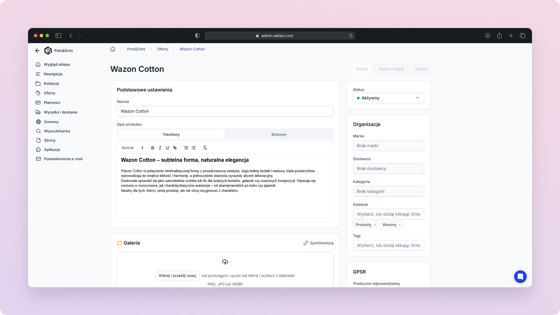 Tagi – Etykiety przypisane do produktu, które ułatwiają kategoryzowanie i wyszukiwanie. Można je wykorzystywać do grupowania produktów według cech, okazji, materiału itp.