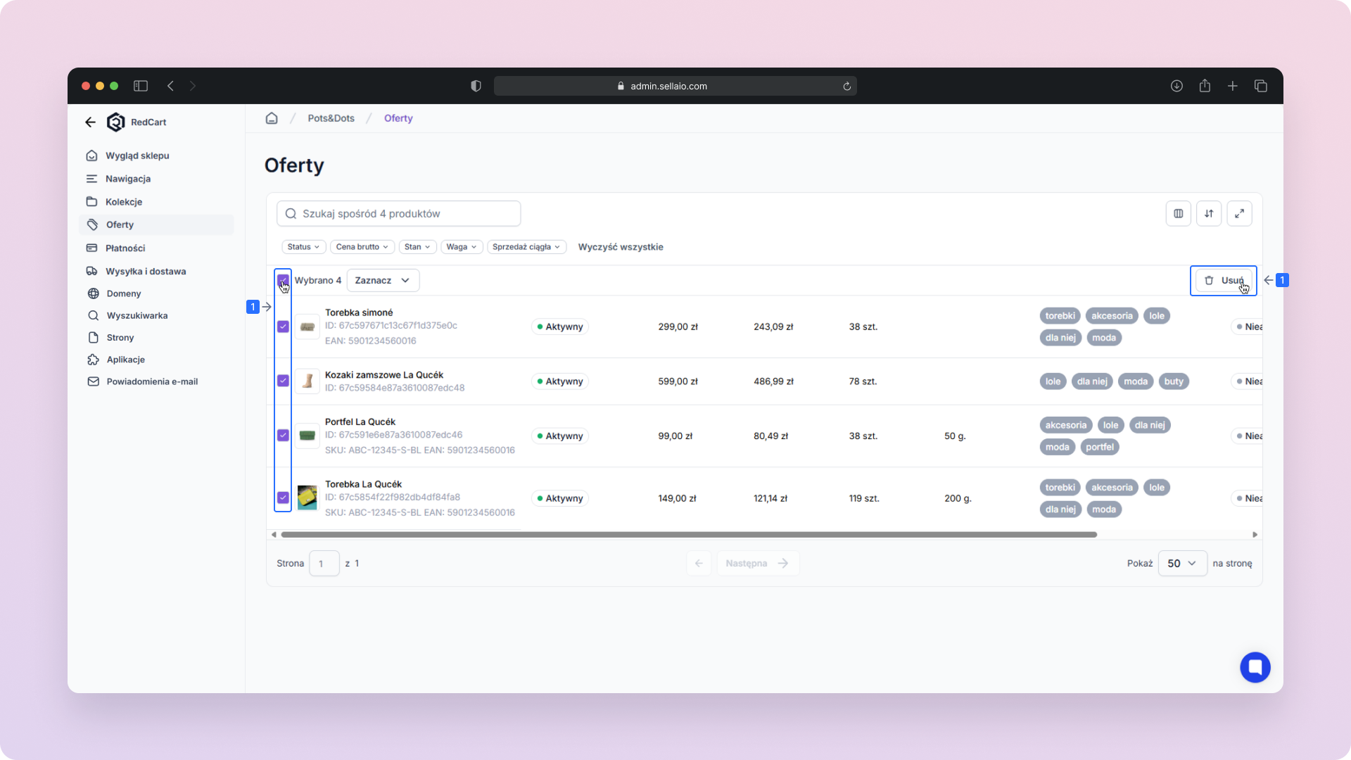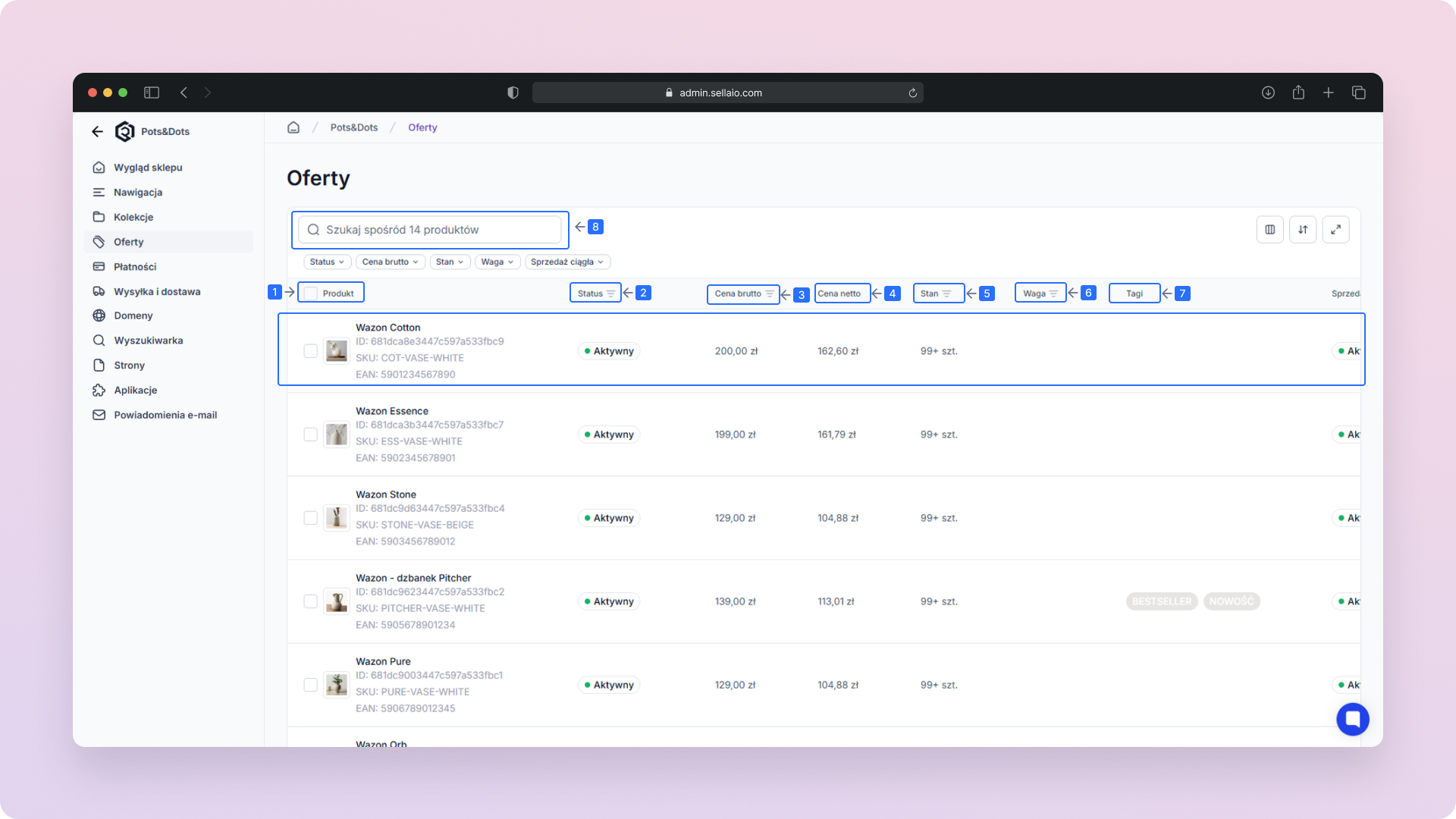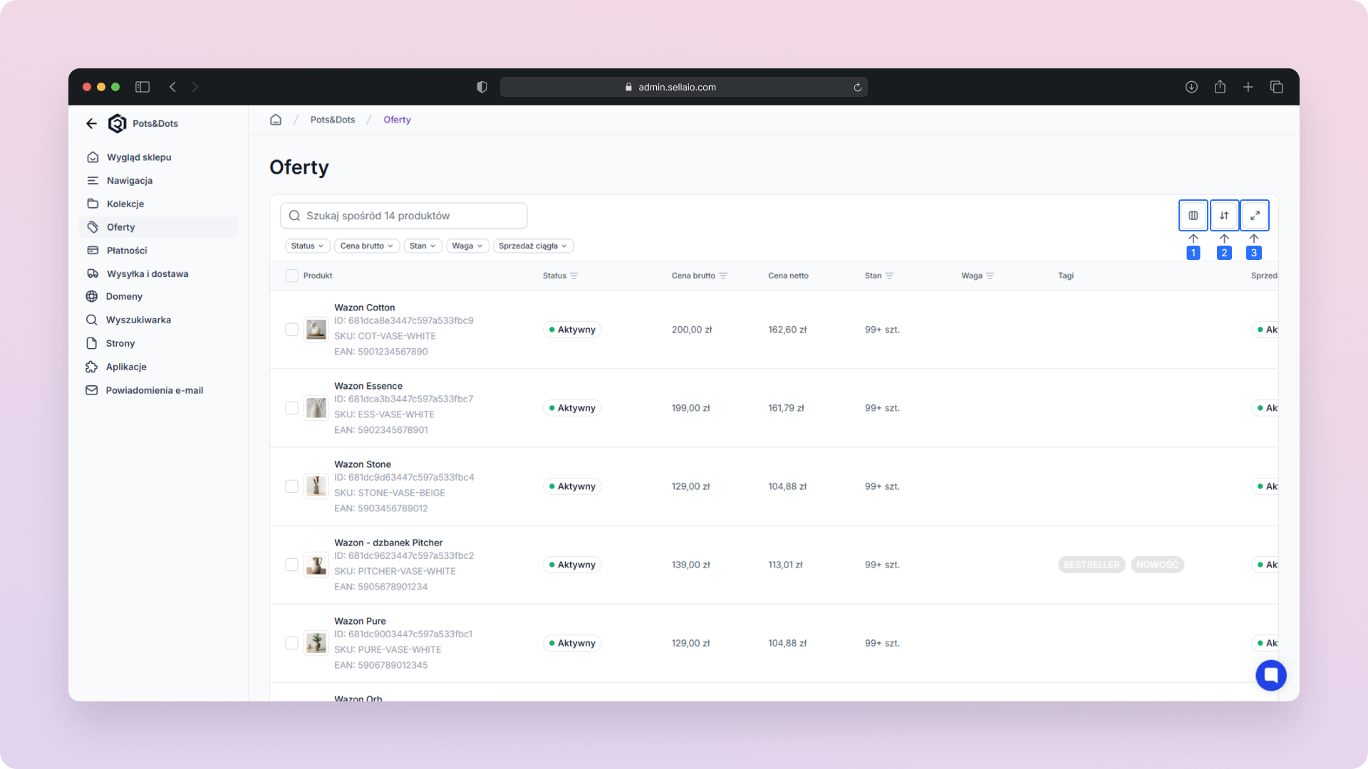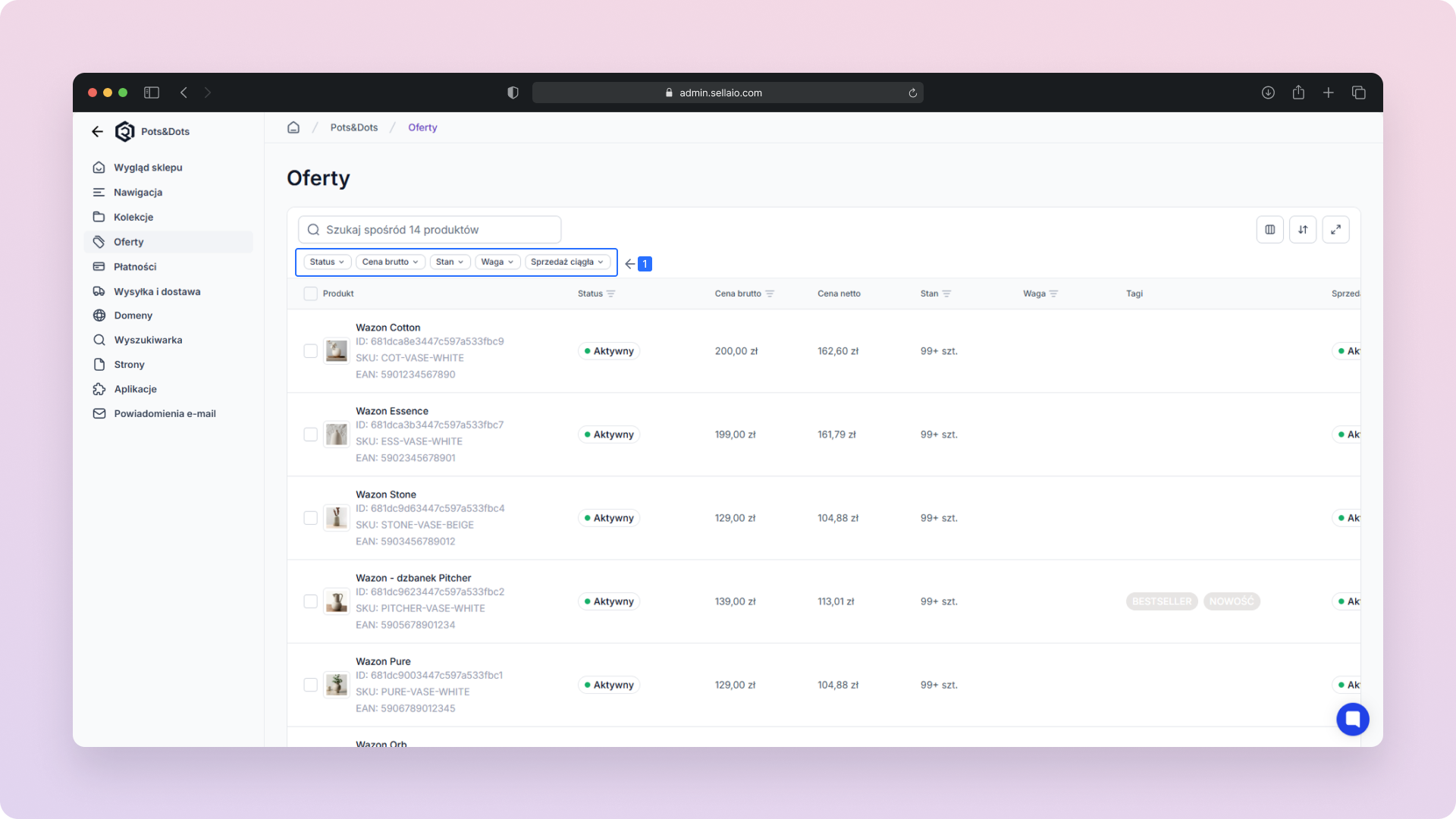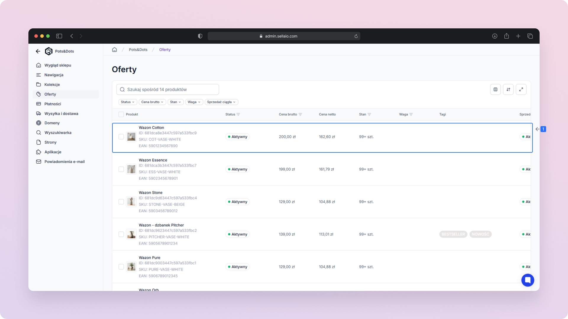 Sekcja Oferty to miejsce, w którym możesz zarządzać asortymentem swojego sklepu. Możesz tu kontrolować ceny, stany magazynowe, statusy dostępności oraz inne istotne informacje o produktach.