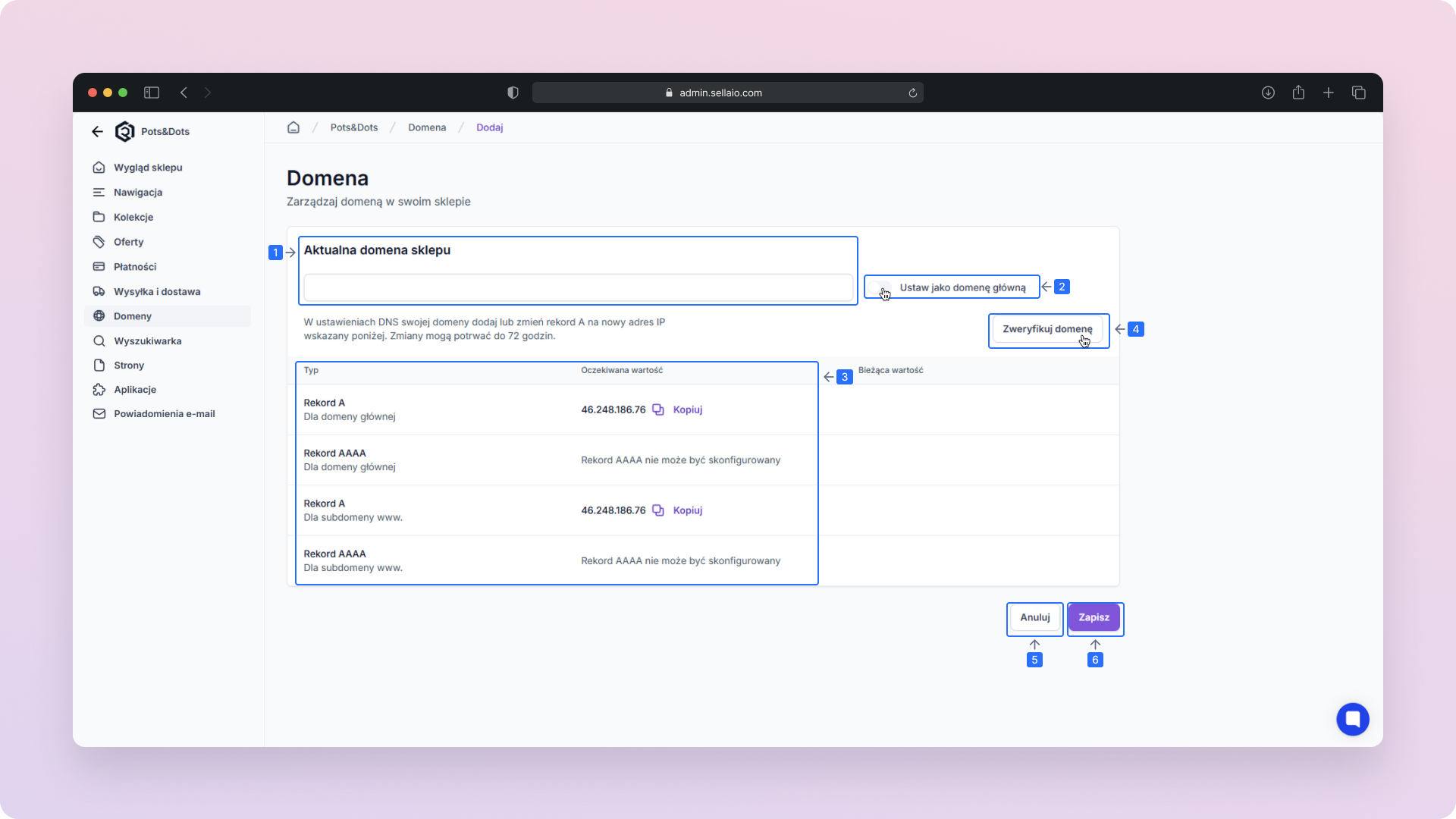 Zapisz – Kliknij, aby zapisać wprowadzone dane i dodać domenę do swojego sklepu.