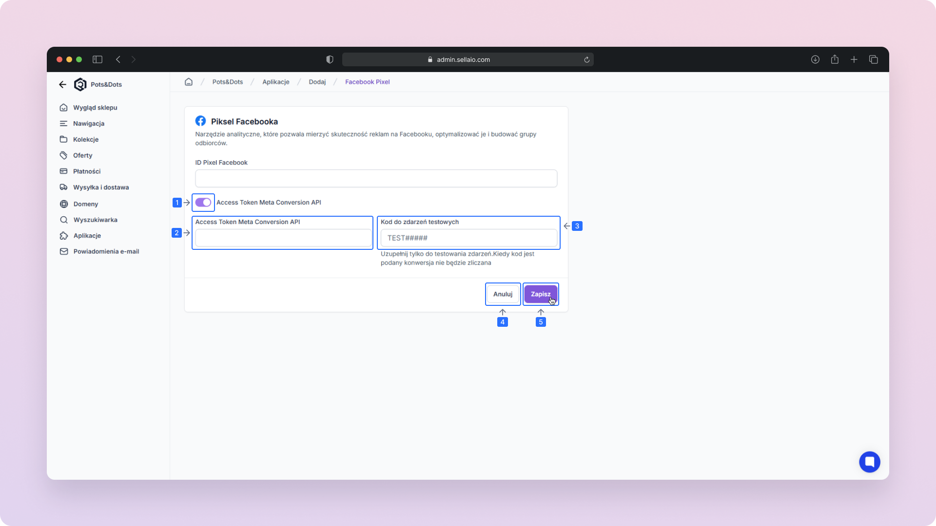 Access Token Meta Conversion API – Wpisz tutaj wygenerowany token dostępu. Jest on niezbędny, aby dane o zdarzeniach były poprawnie przekazywane z Twojego sklepu do systemu Meta.
