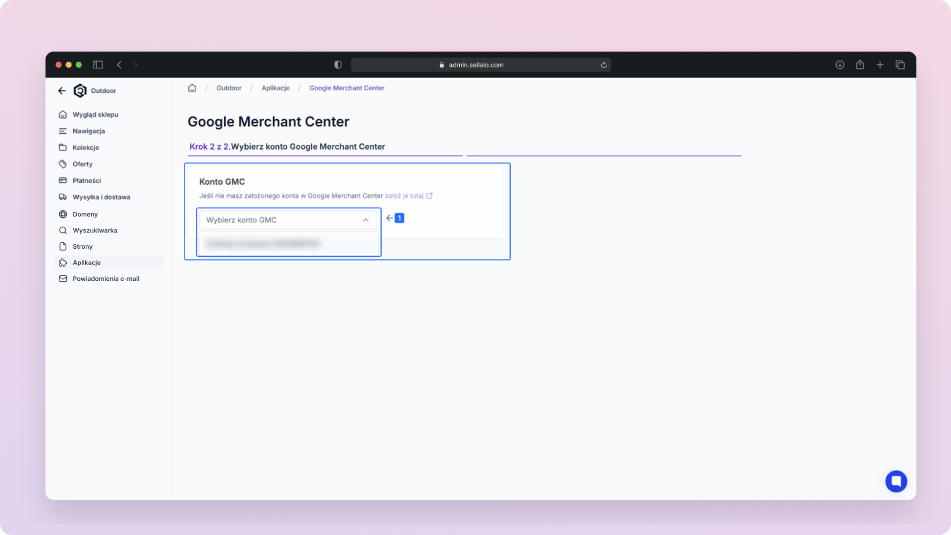 Wybierz konto Google Merchant Center - Wyświetli się widok z możliwością wyboru konta GMC.