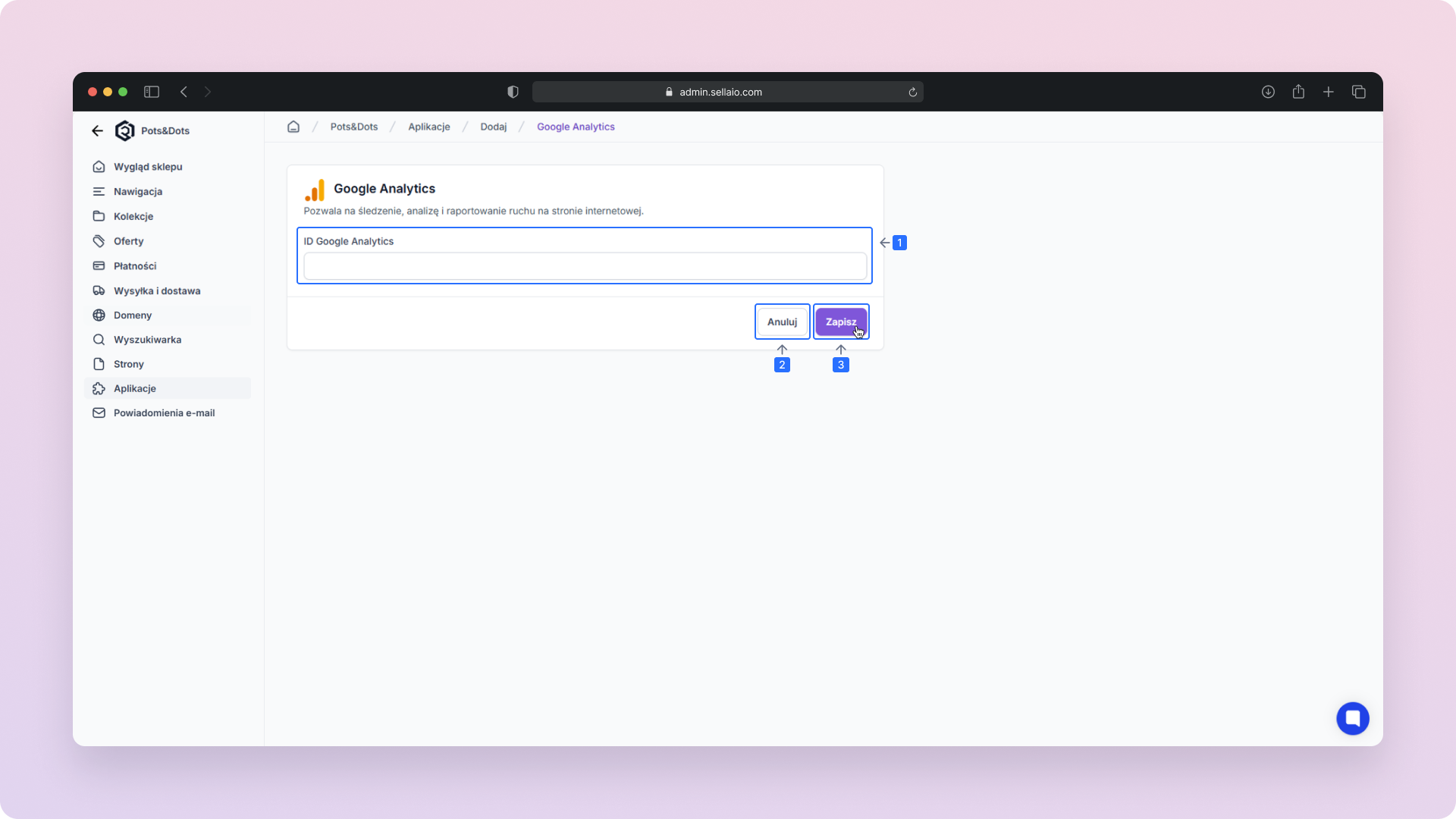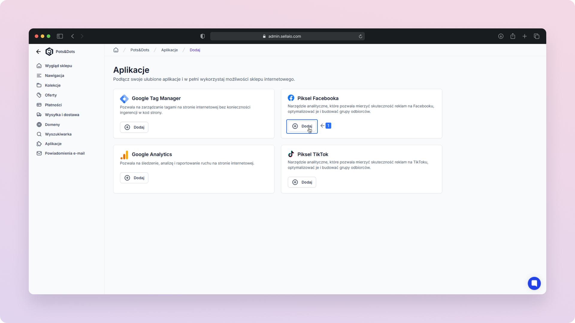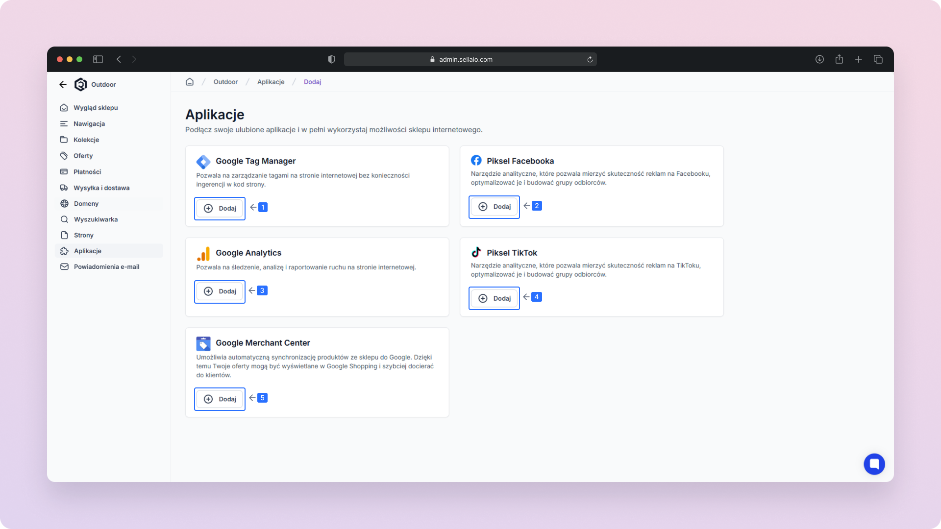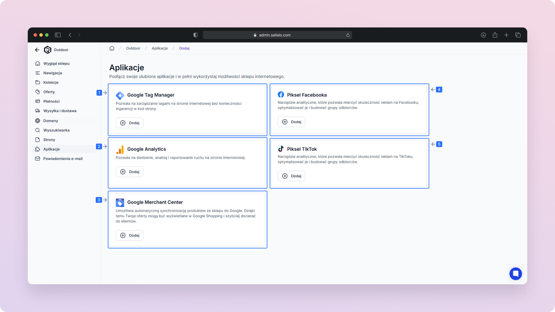 Aplikacje - W tej sekcji zobaczysz listę dostępnych integracji z popularnymi narzędziami analitycznymi i reklamowymi
