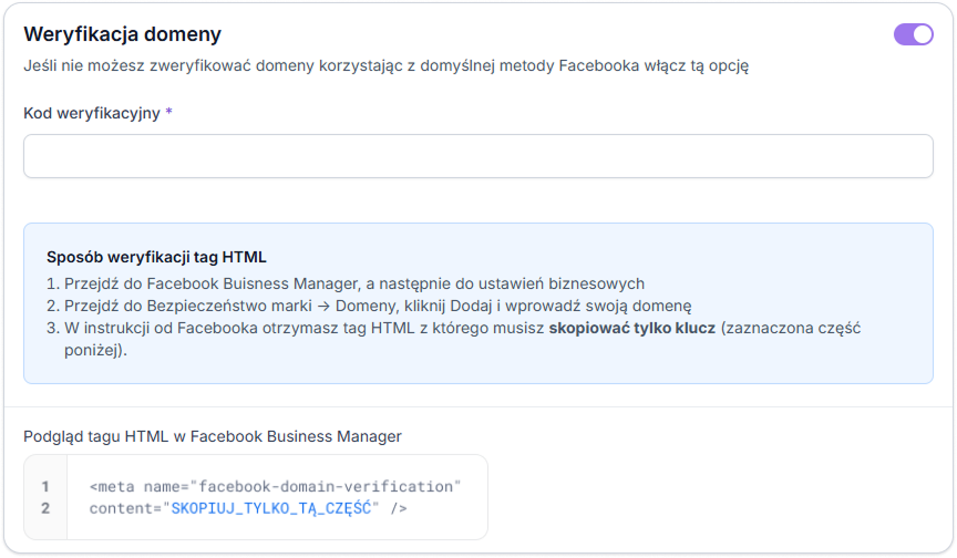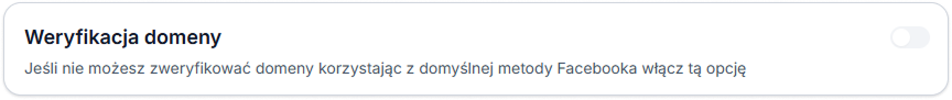 Weryfikacja domeny – Jeśli nie możesz zweryfikować domeny za pomocą domyślnej metody Facebooka, włącz tę opcję.