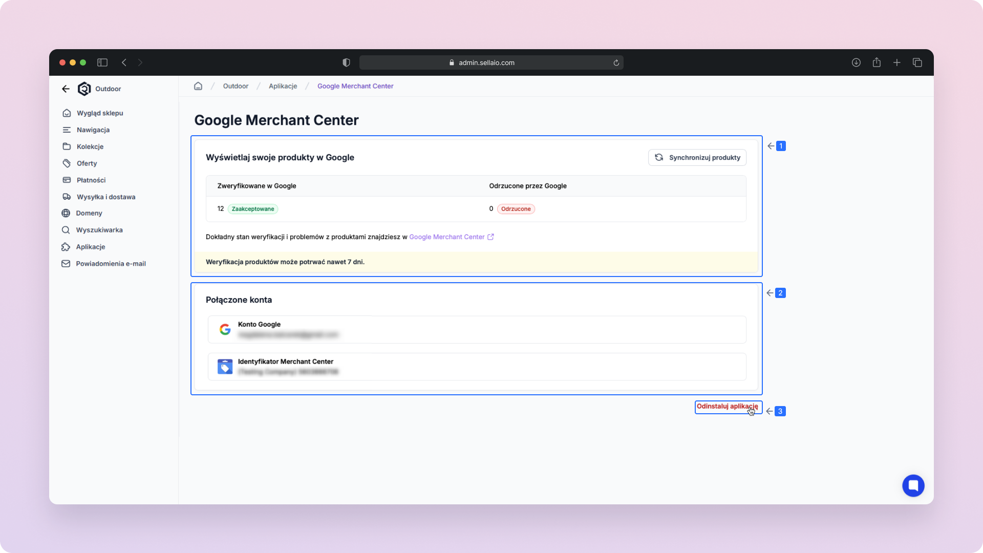 Odinstaluj aplikację – Kliknij ten przycisk, aby odinstalować Google Merchant Center (GMC).
