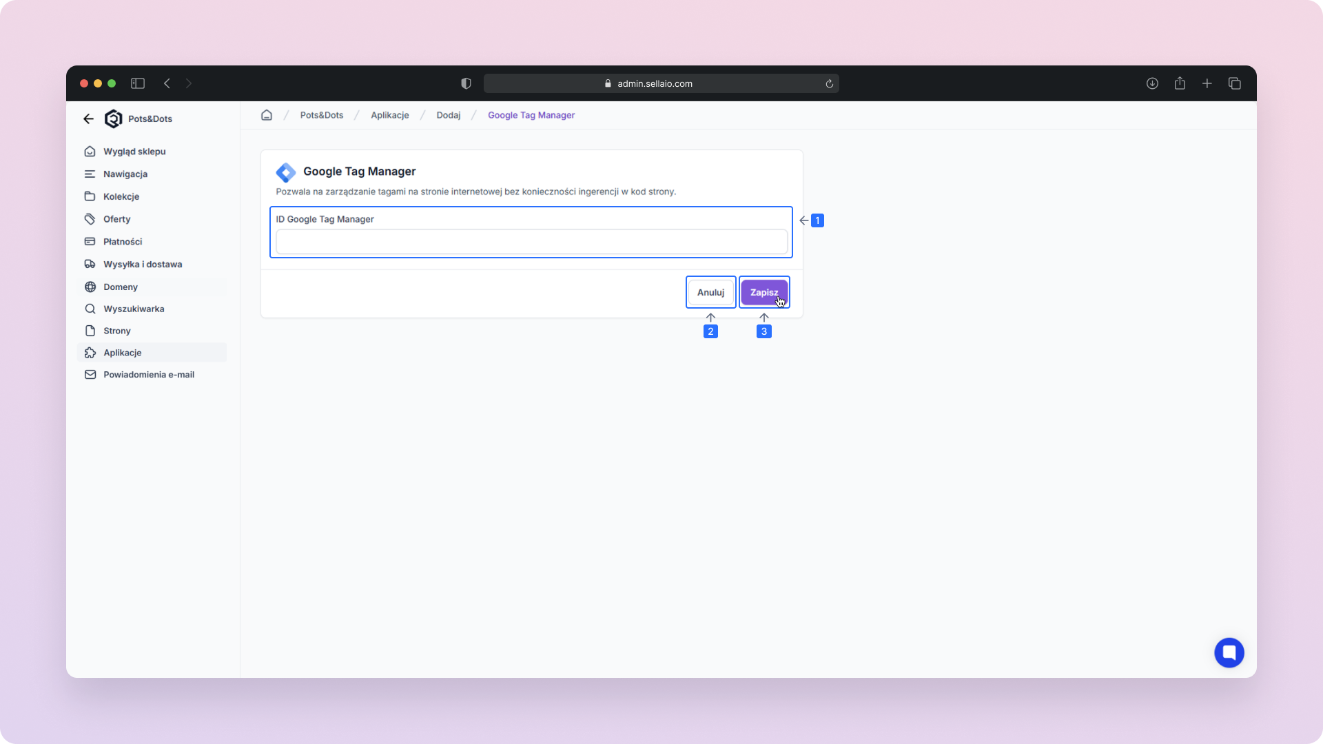 Sekcja Aplikacje w kanale sprzedaży pozwala na podłączenie ulubionych narzędzi analitycznych i reklamowych. W tej sekcji znajdziesz integracje z Google Tag Managerem (GTM), Google Analytics, Pikselem Facebooka, Meta Conversion API, Pikselem TikToka, a także Google Merchant Center. Te narzędzia umożliwiają zarządzanie tagami na stronie, śledzenie i analizowanie ruchu na witrynie, a także mierzenie skuteczności reklam na Facebooku i TikToku.