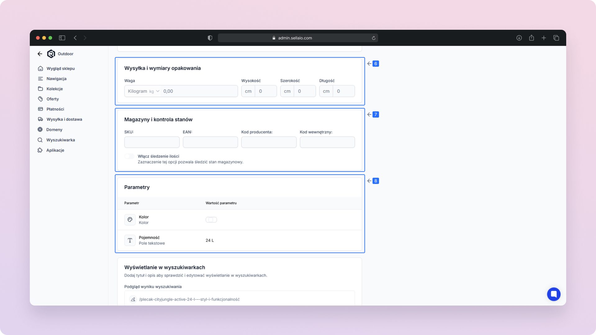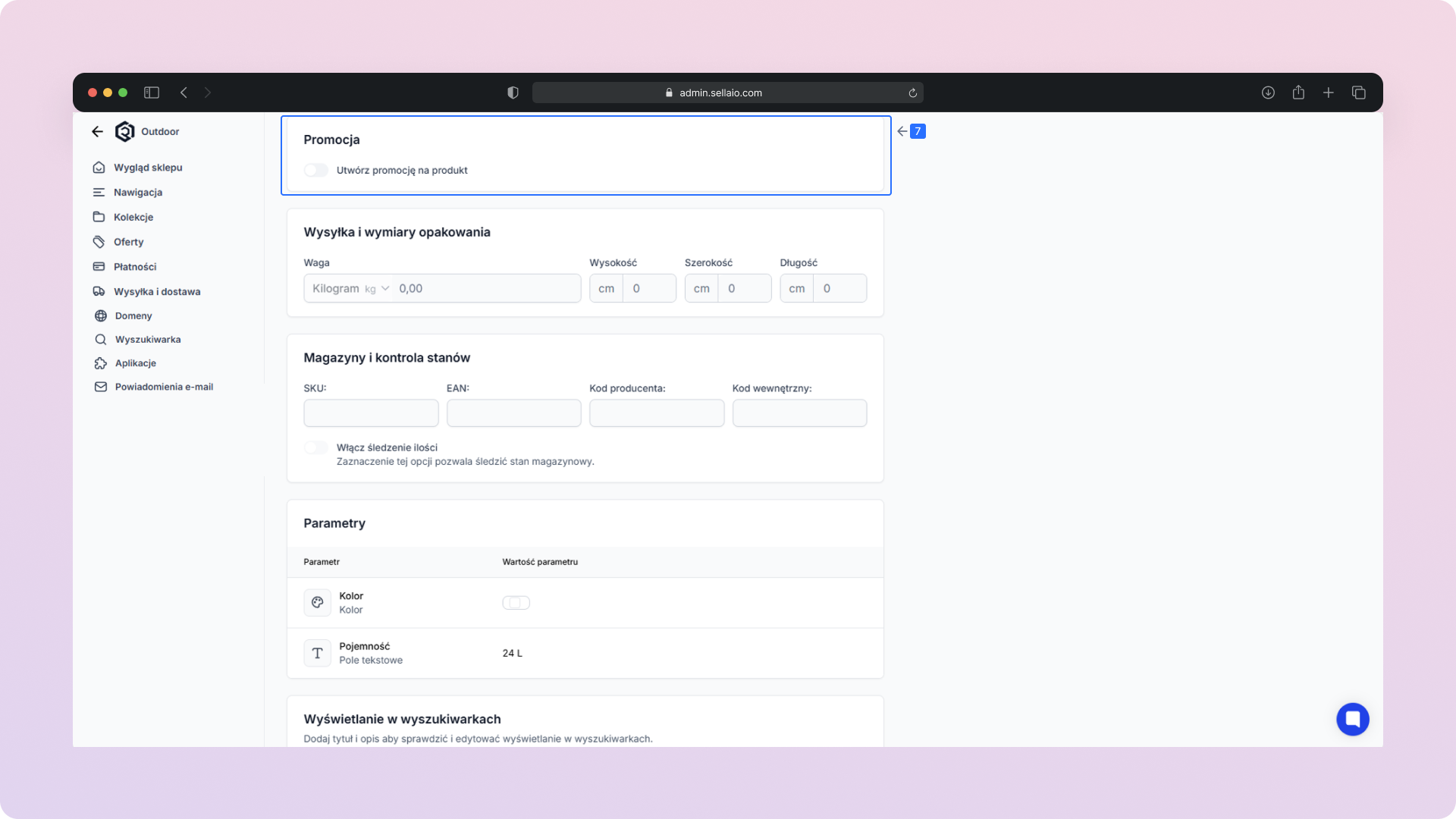 Wyświetlanie w wyszukiwarkach – Edytuj dane, które wpływają na widoczność produktu w wynikach wyszukiwania (np. tytuł, opis, słowa kluczowe).