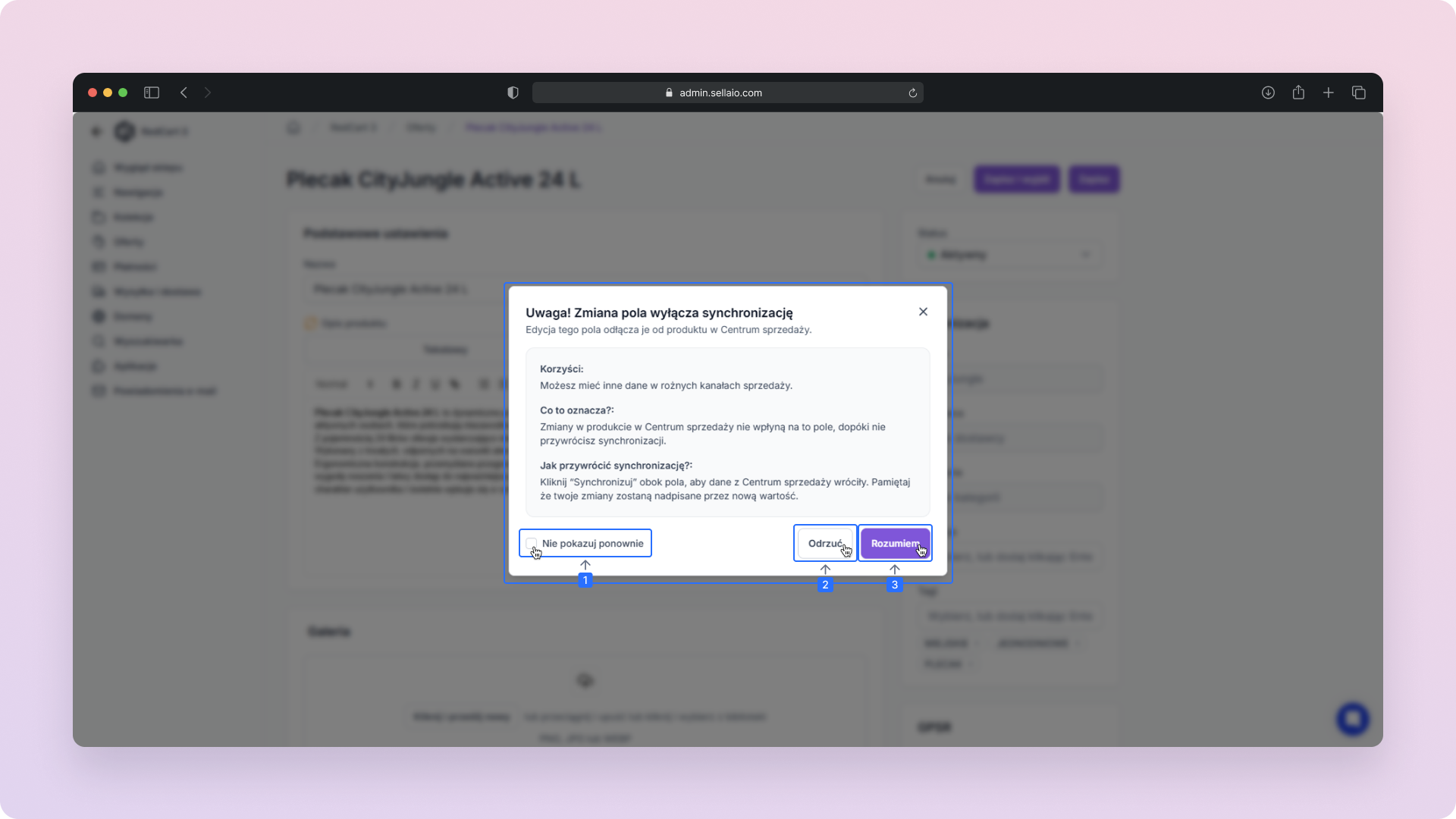 Podczas zmiany nazwy lub opisu produktu w Kanale sprzedaży pojawia się komunikat, informujący że edycja tego pola spowoduje odłączenie go od produktu w Centrum sprzedaży.
