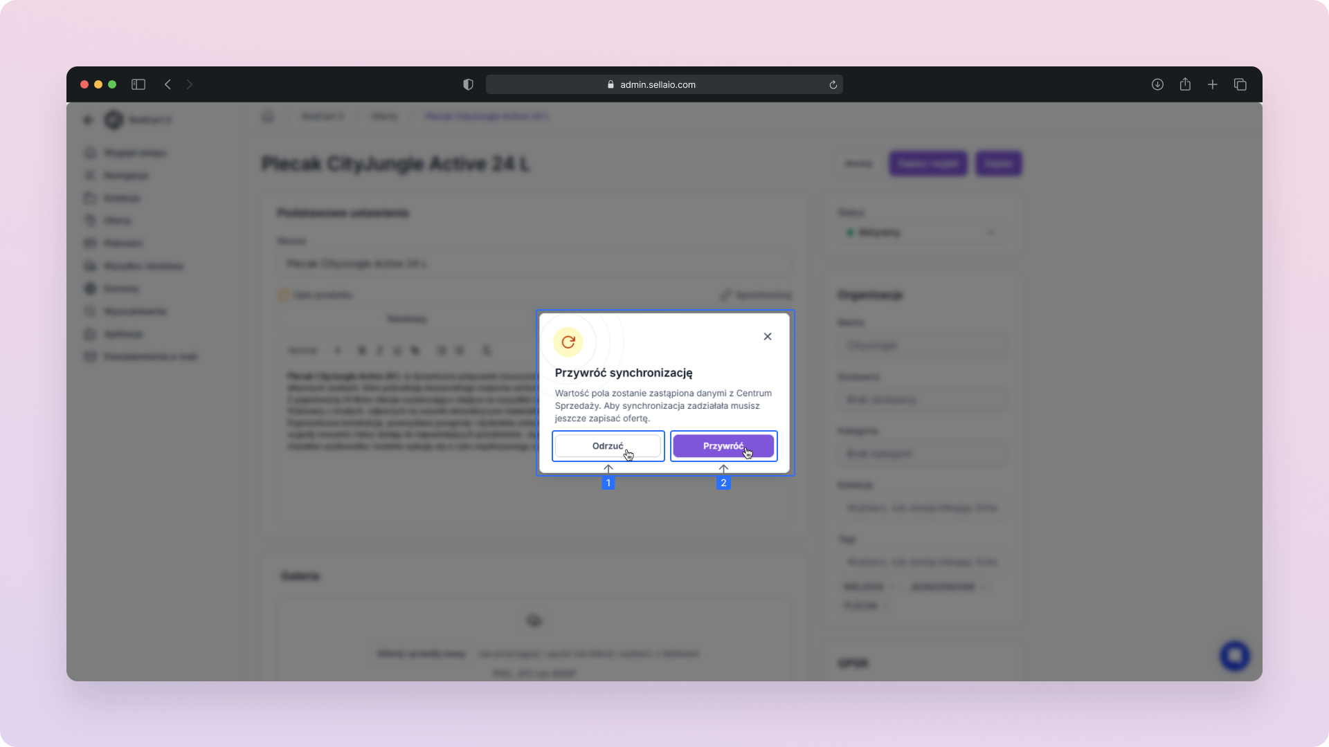 Przywróć synchronizację – Pojawi się okno z prośbą o potwierdzenie. Wartość pola zostanie zastąpiona danymi z Centrum Sprzedaży.