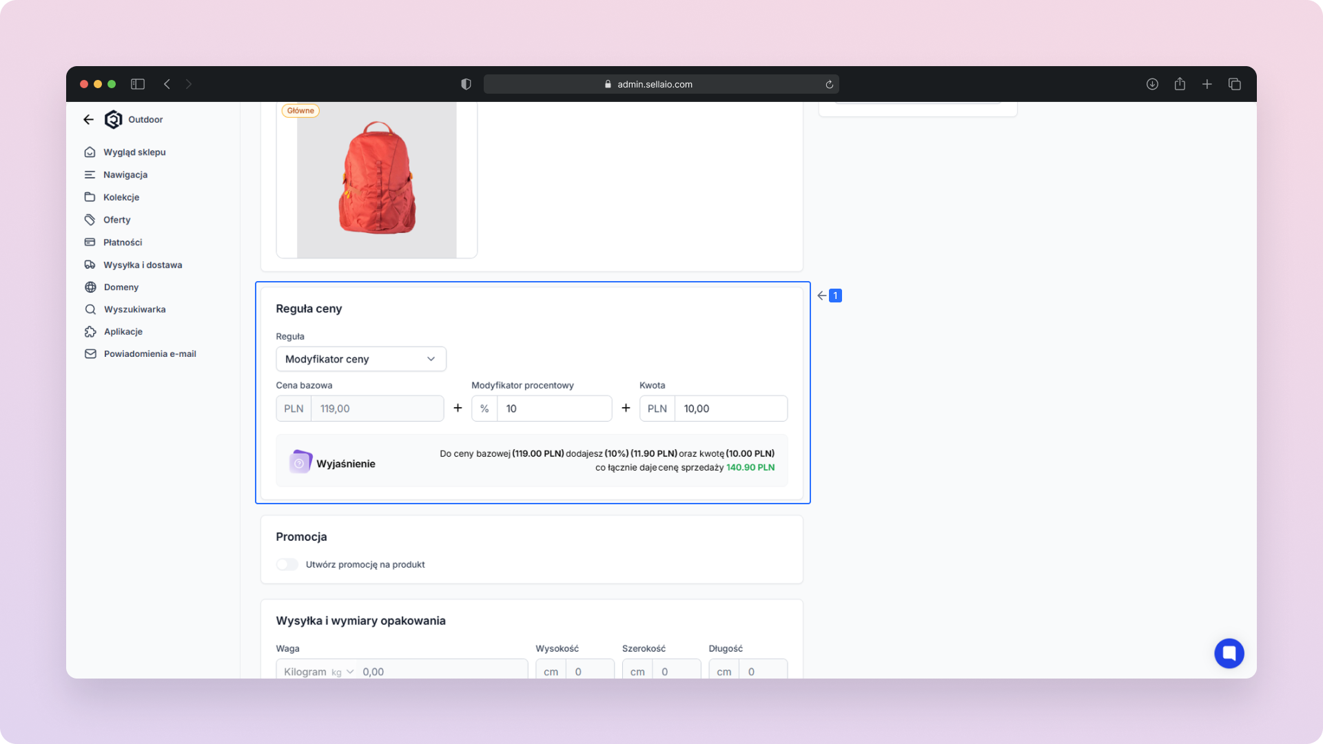 Modyfikator ceny – Możesz ustawić modyfikator, który automatycznie przeliczy cenę na podstawie ceny bazowej. Do ceny bazowej możesz dodać określony procent oraz dodatkową kwotę.