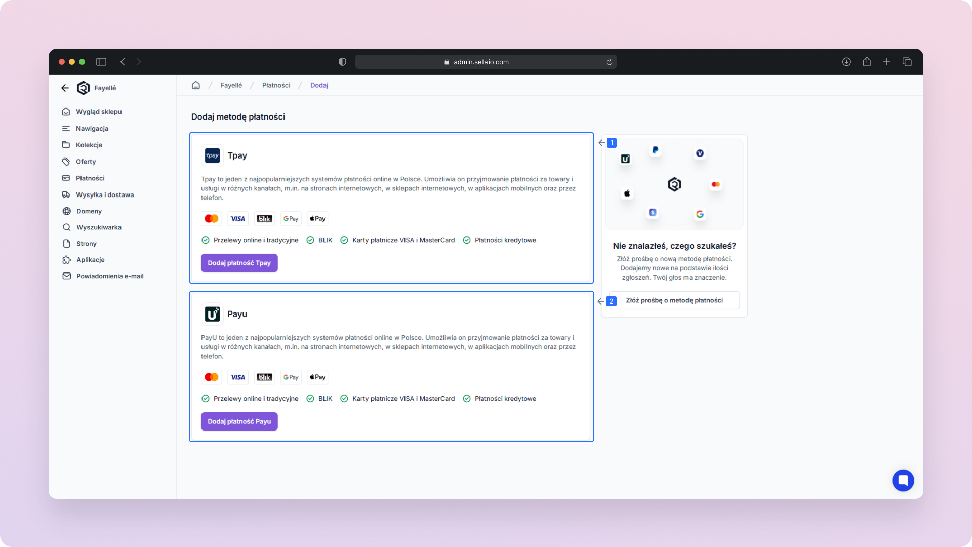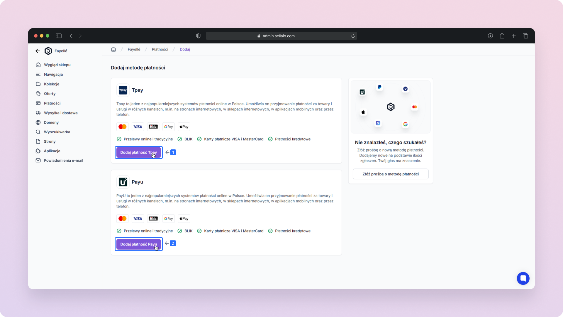 Dodaj płatność Tpay/PayU – Kliknij przycisk obok Tpay lub PayU, aby przejść do formularza konfiguracji i rozpocząć proces integracji z tą metodą płatności.