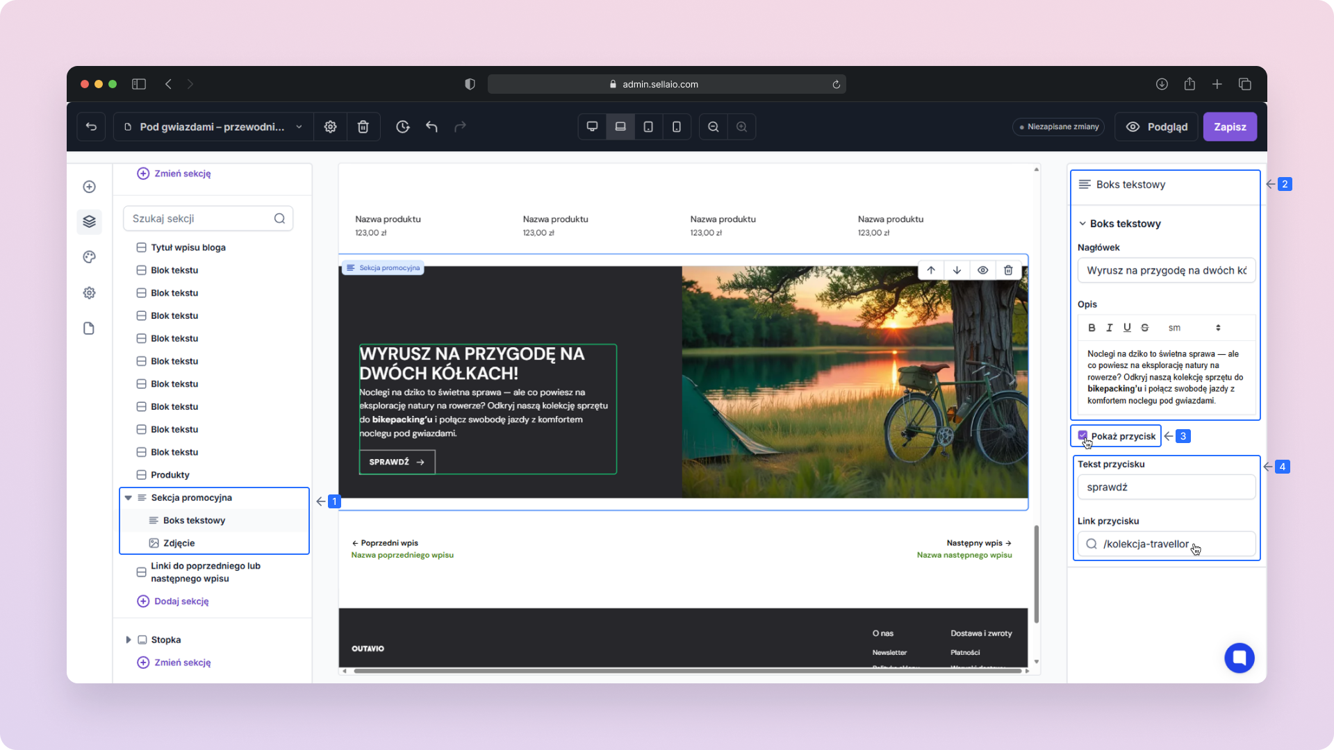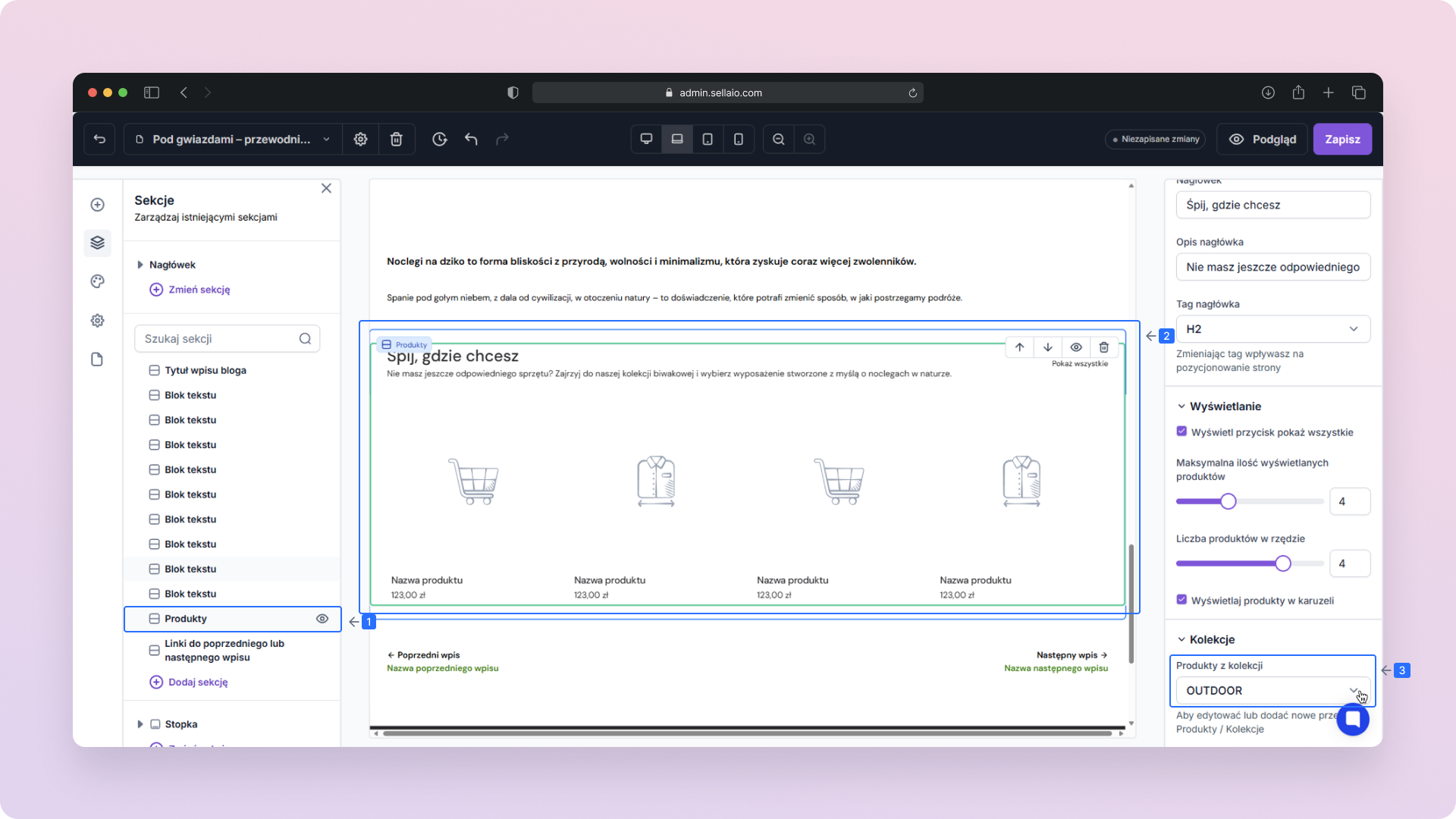 Następnie podlinkuj wybraną przez Ciebie kolekcję produktów. Mogą to być np. artykuły powiązane tematycznie z treścią wpisu lub popularne bestsellery, które chcesz wyróżnić.