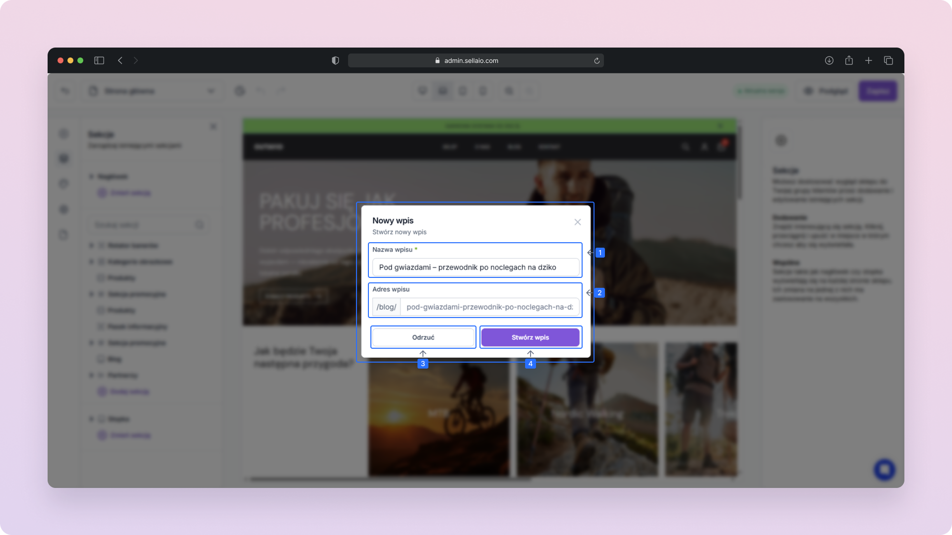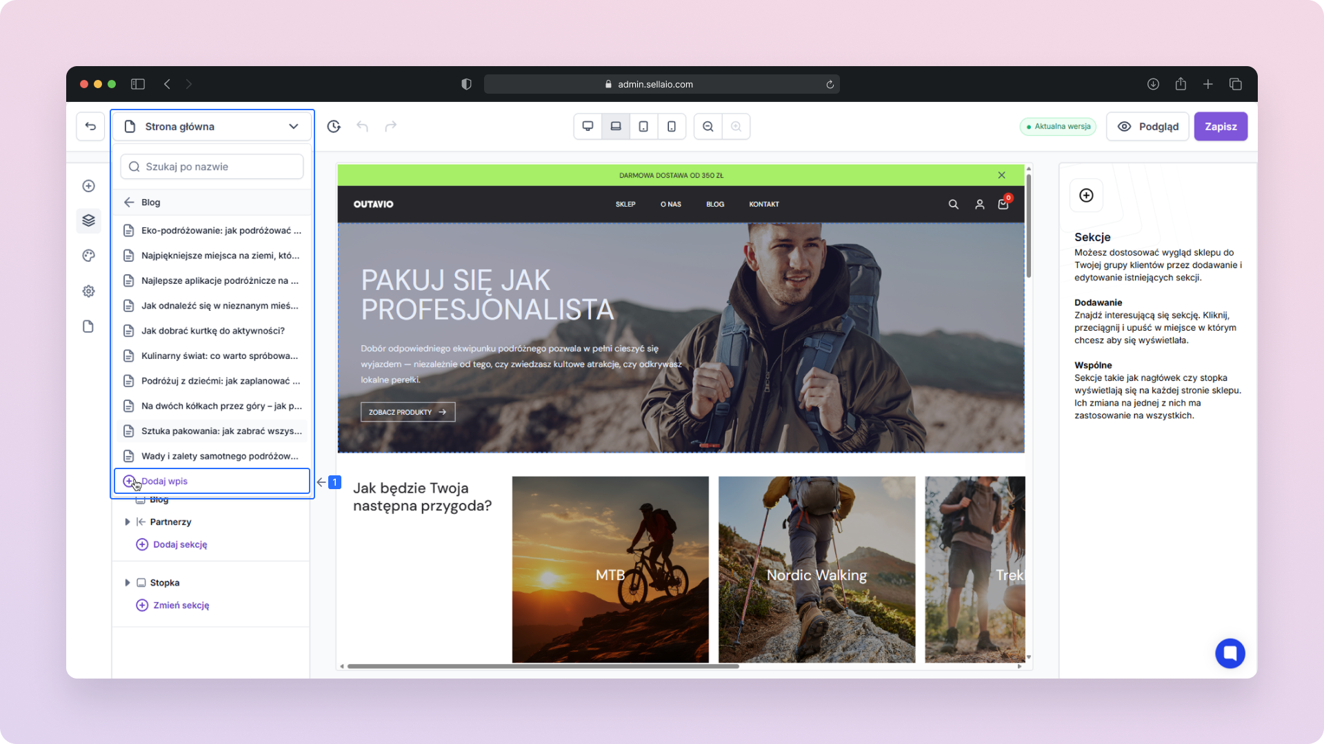 Dodaj sekcje - Z tego miejsca możesz bezpośrednio dodawać nowe sekcje do wpisu.