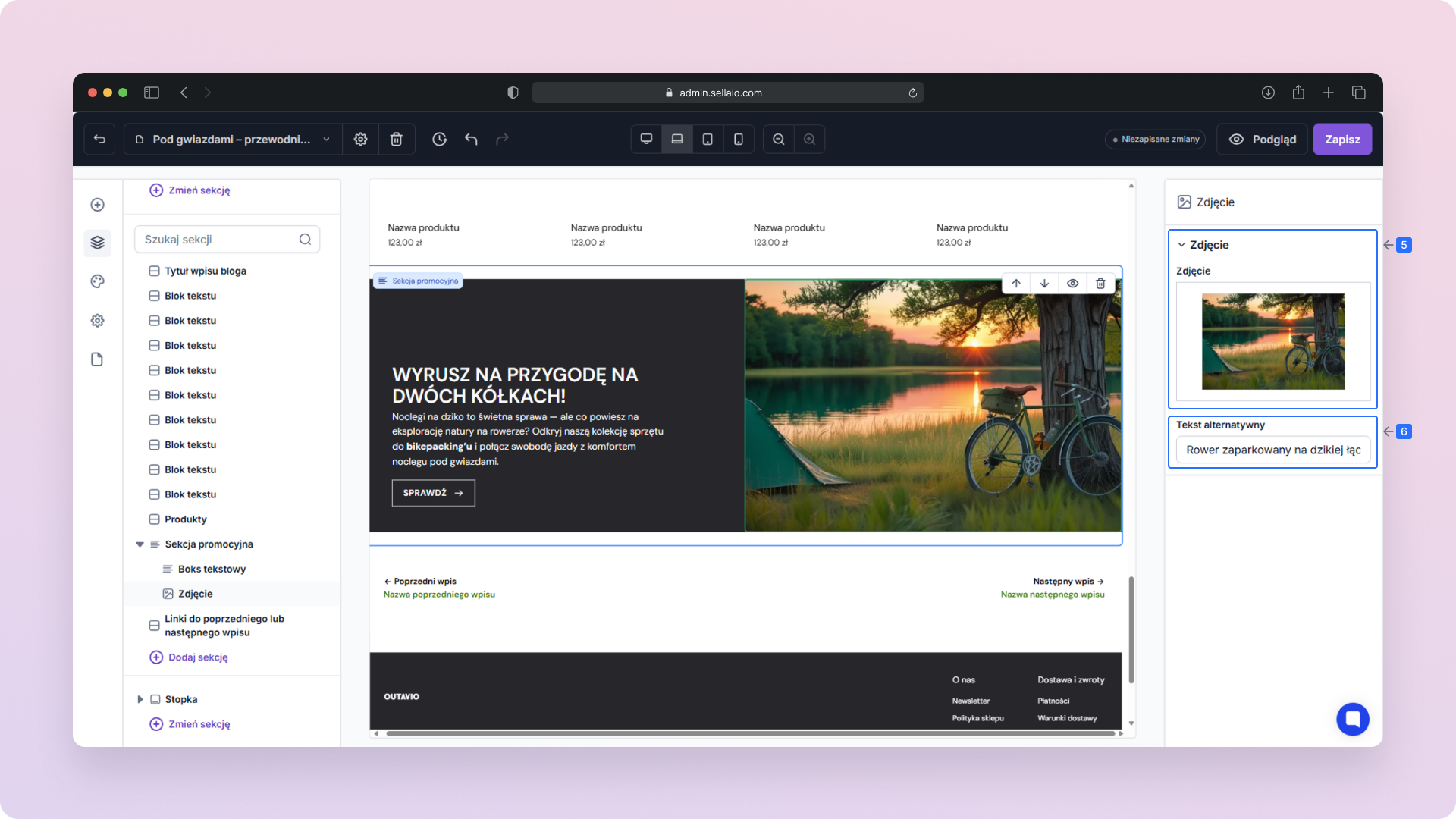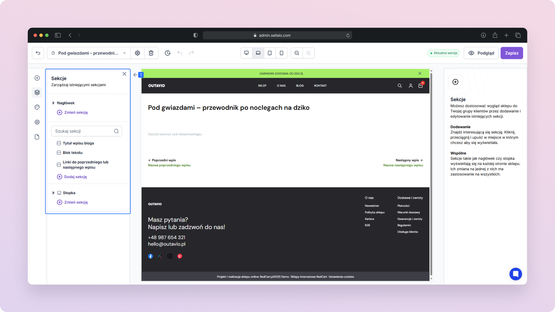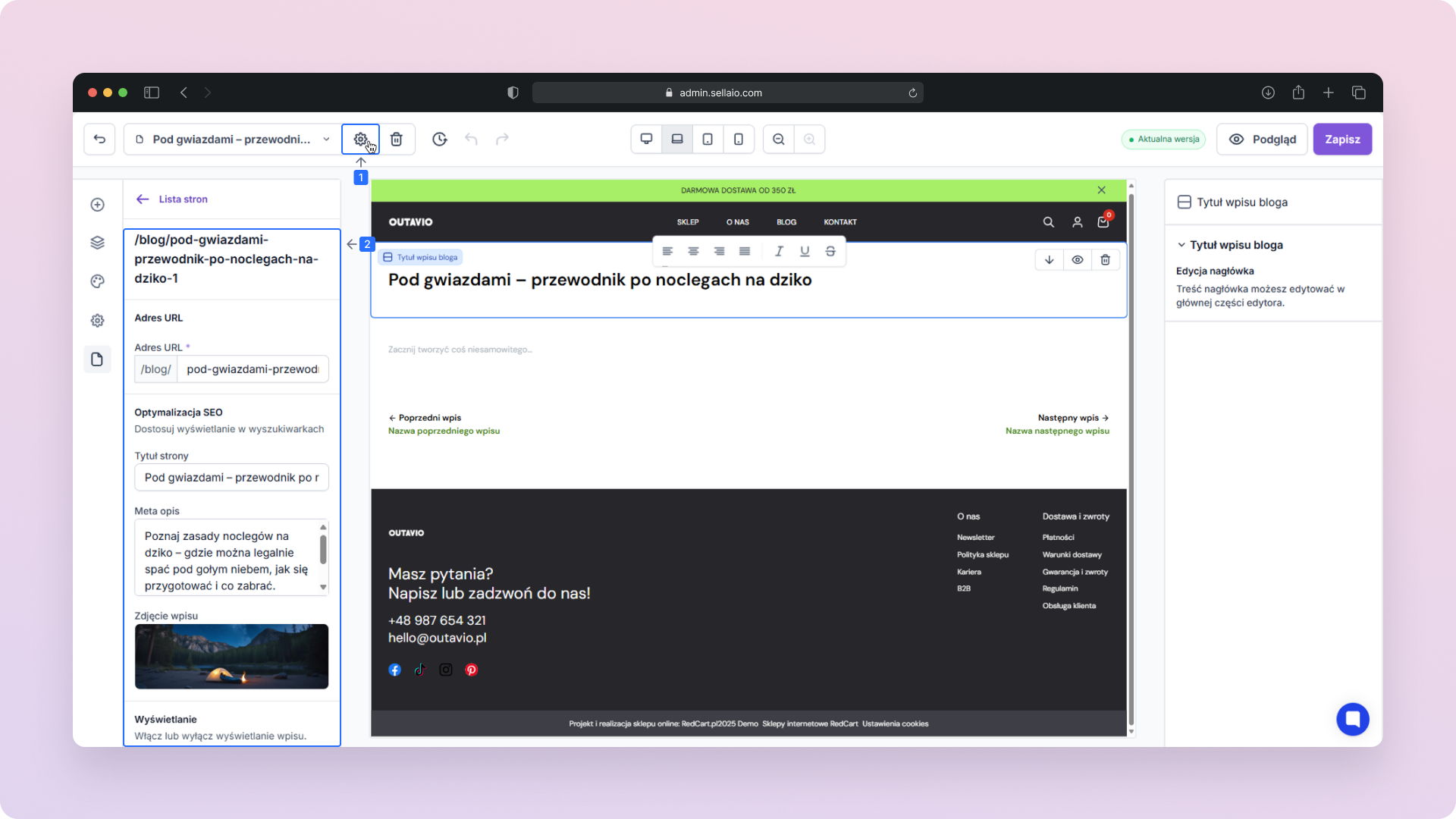 W Designerze masz pełną kontrolę nad treścią bloga: możesz łatwo edytować tekst, dostosowywać formatowanie oraz konfigurować ustawienia SEO dla każdego wpisu. To ważny krok w kierunku zwiększenia widoczności Twojego sklepu w wynikach wyszukiwania.