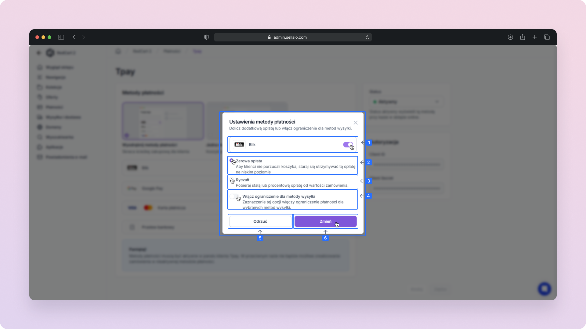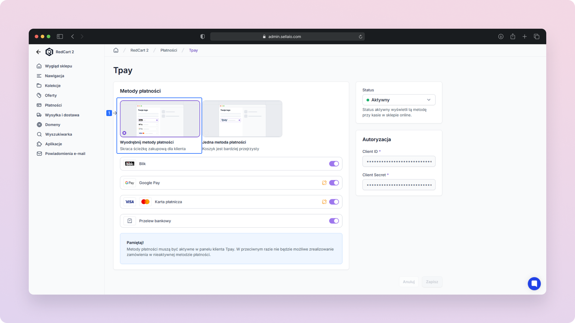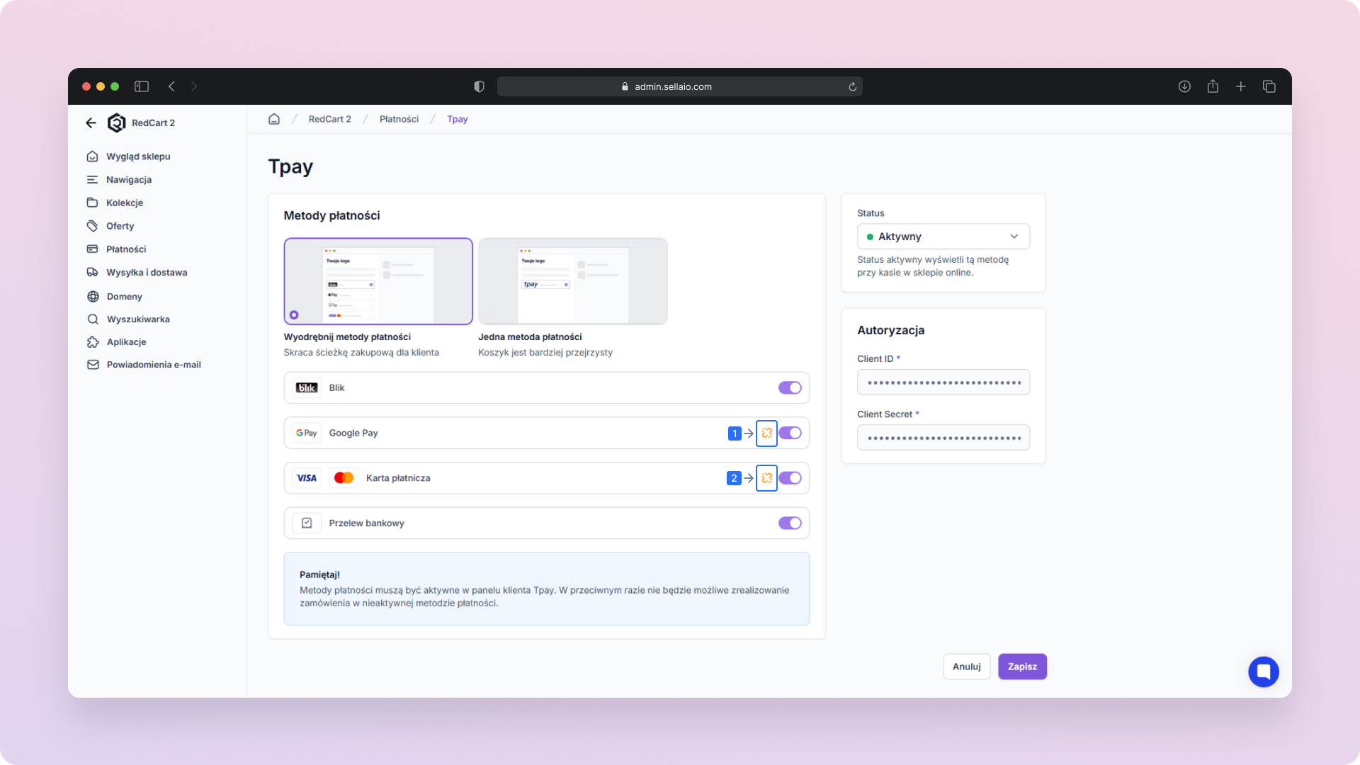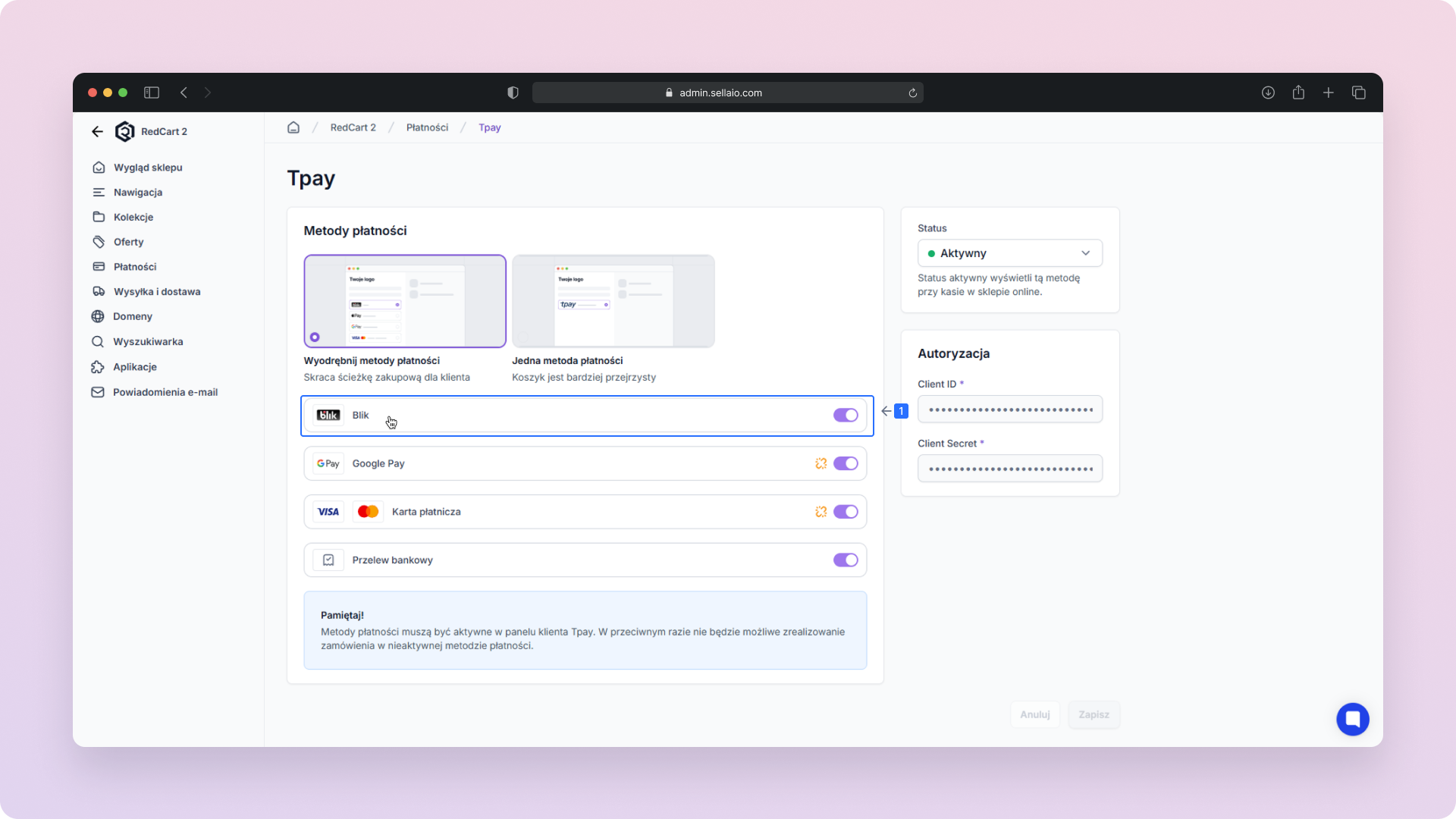 Włączenie / wyłączenie np. BLIKa – Możesz włączyć lub wyłączyć dowolną metodę płatności, np. BLIK one-step, kartę płatniczą czy płatności mobilne.