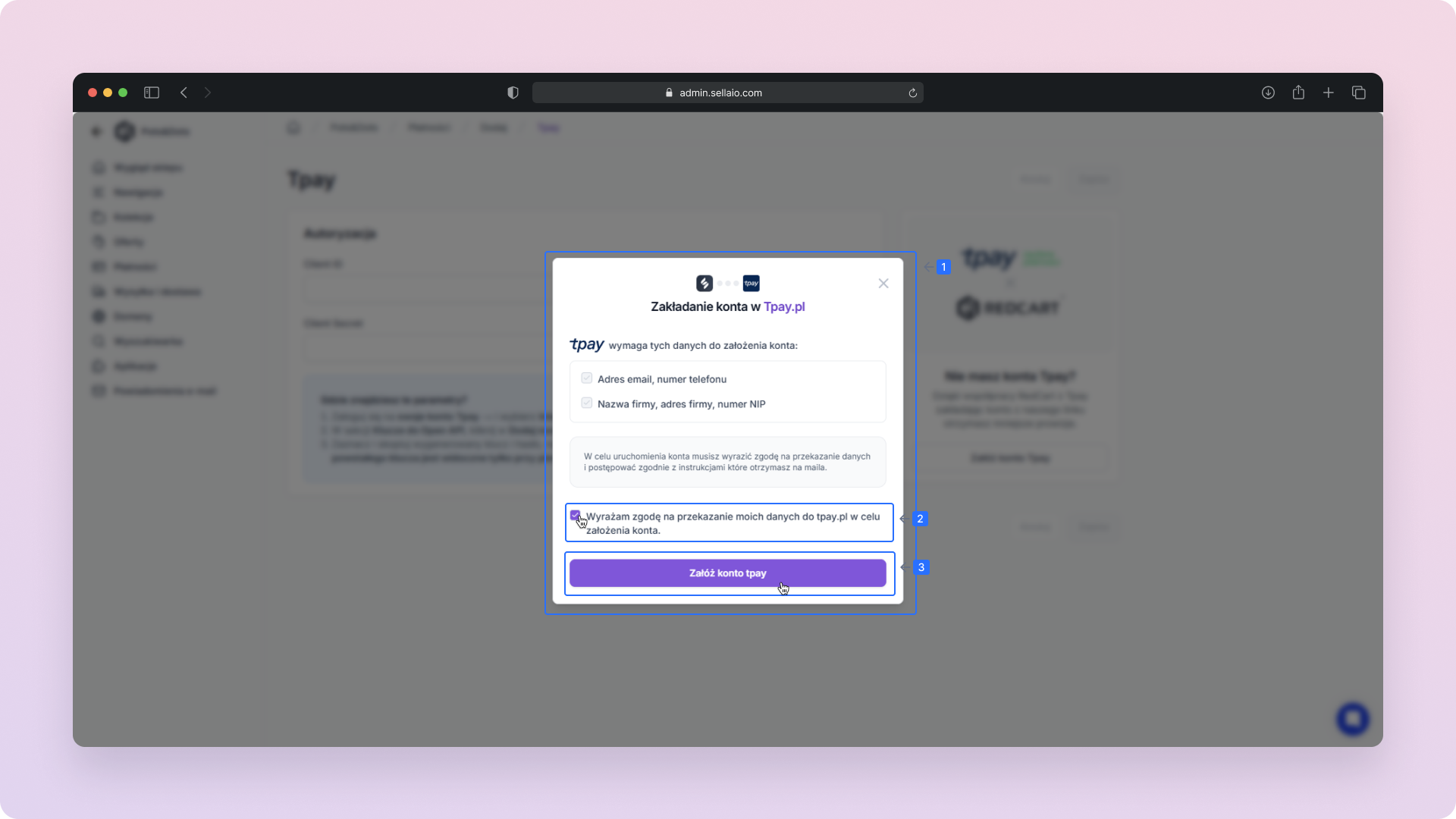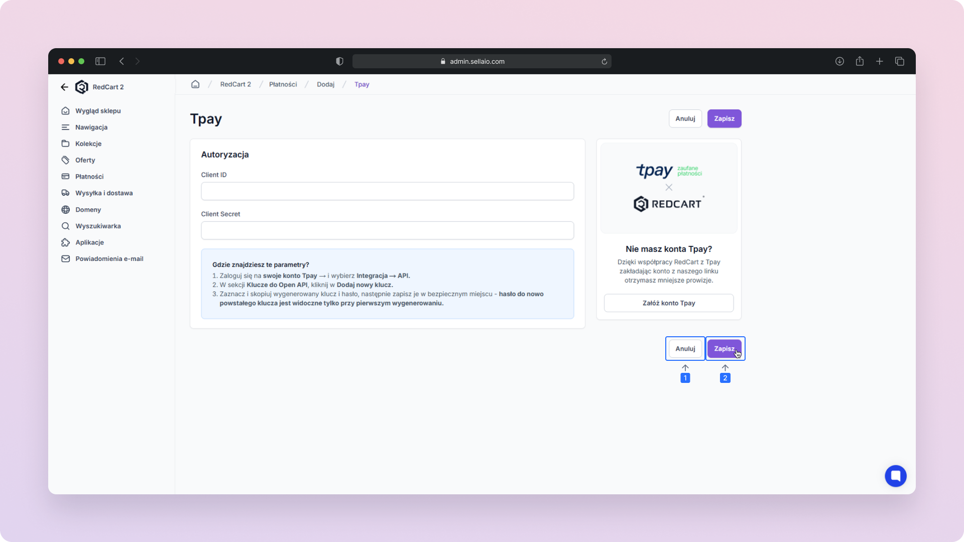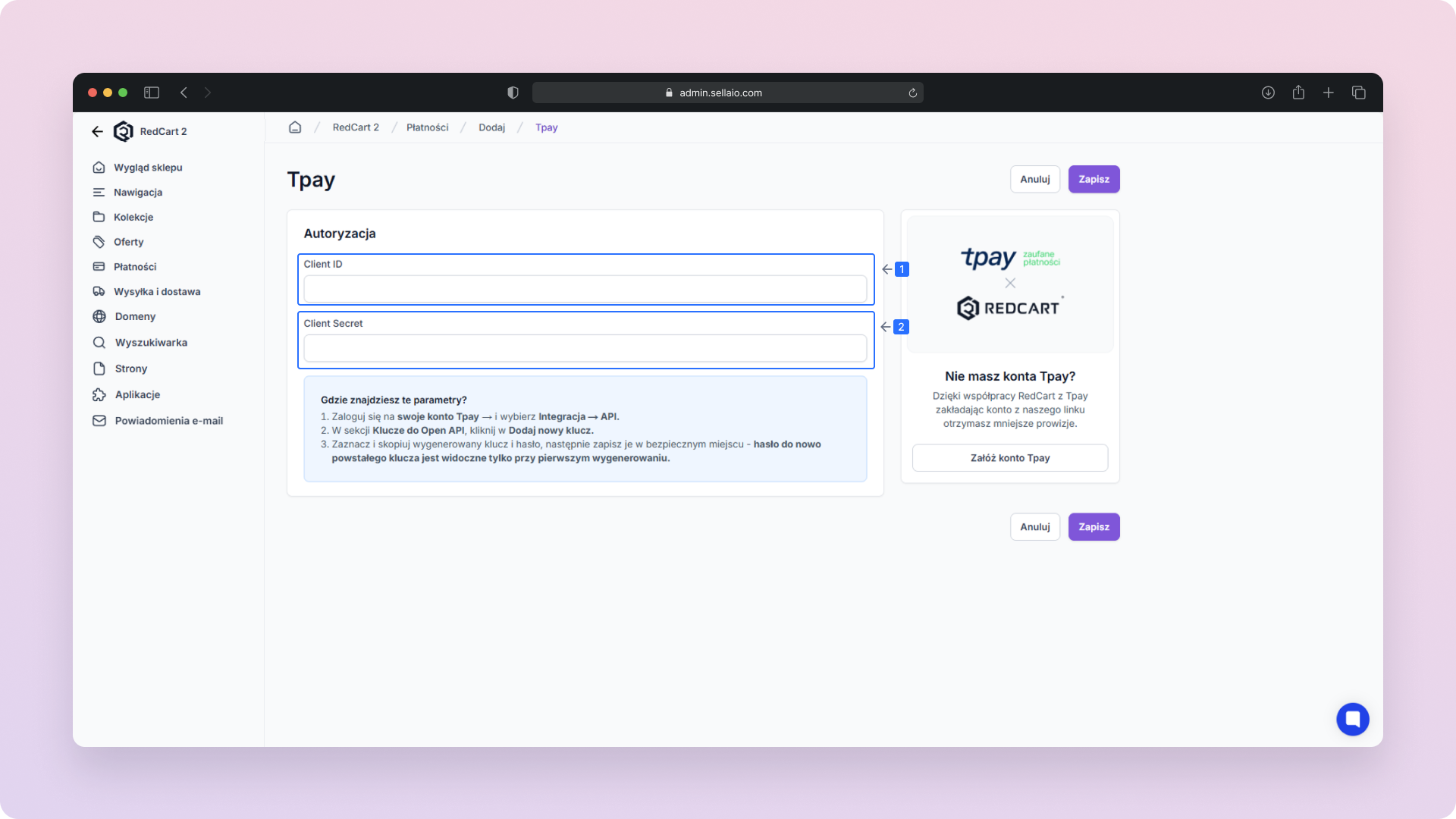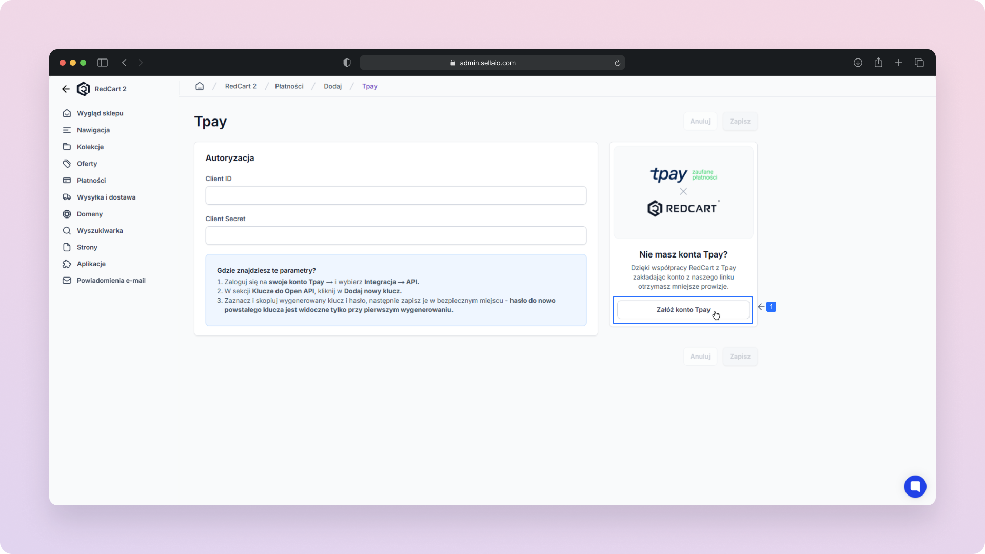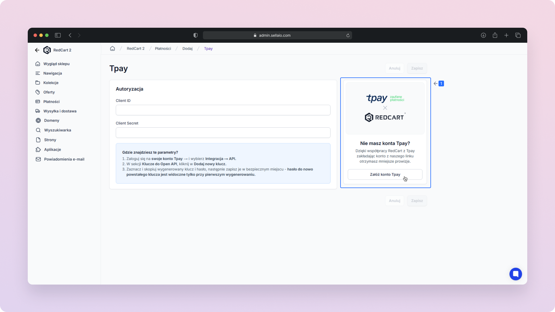 Jeśli nie posiadasz jeszcze konta Tpay, możesz założyć je bezpośrednio z poziomu panelu RedCart.