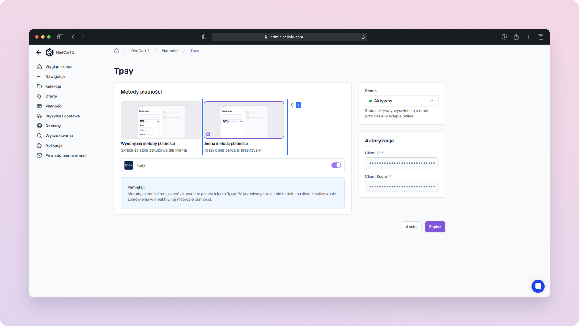 Status – Status „Aktywny” oznacza, że dana metoda płatności będzie widoczna dla klientów podczas składania zamówienia.
